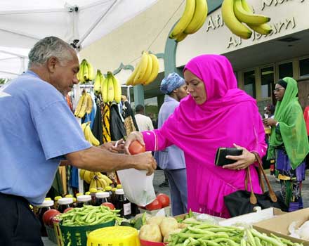 Black Muslims living near the Atlanta Majid of Islam market conveniently after Friday prayer service. Many of the black Muslims living in the United States converted to Islam in the 1960s and 1970s.