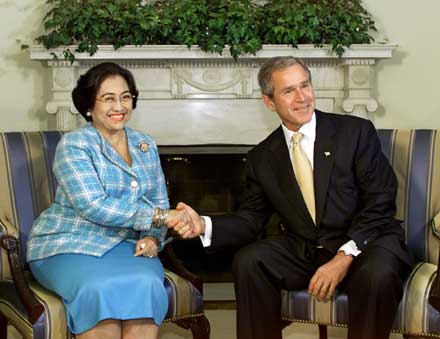 President George Bush meets at the White House with Indonesian President Megawati Sukarnoptri, head of the world's most populous Muslim nation, on September 19, 2001.