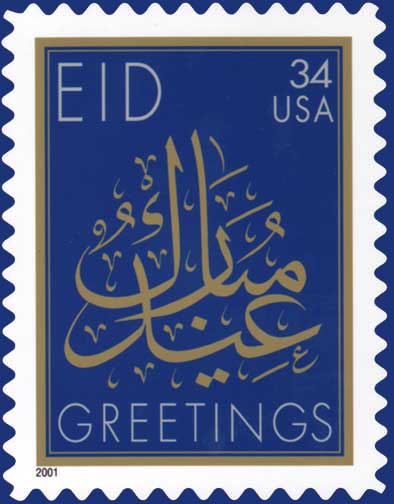 | "Eid mubarak," or "May your religious holiday be blessed," is the message on the Eid stamp, honoring the two important Muslim festivals. The U.S. Postal Service issued the stamp on September 1, 2001, at the annual convention of the Islamic Society of North America. (Photo by REUTERS/TimePix)