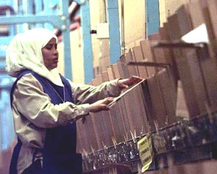 In Columbus, Ohio, a Muslim woman works the packing line at a food distribution center.